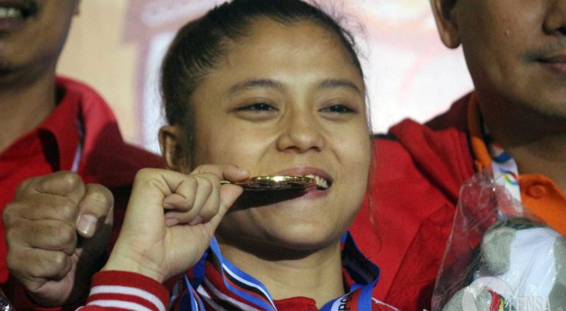 Maya Sheva Atlet Karateka DKI Jakarta berpose setelah menyabet…