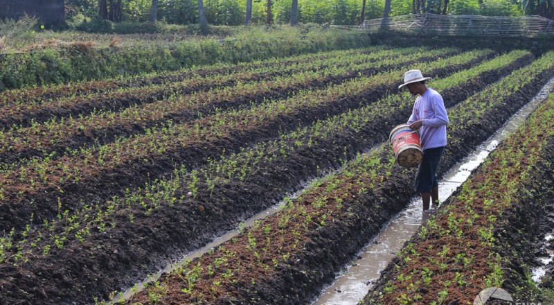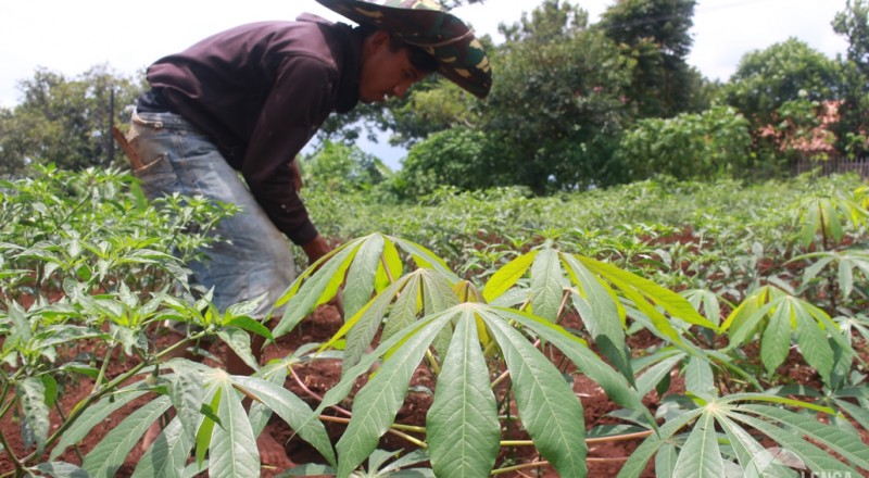 Umen (25) membuat saluran air di area penanaman singkong dan…