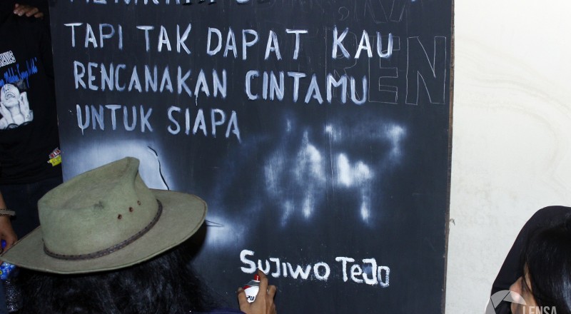 Sujiwo Tejo menandatangani papan yang disediakan oleh Lembaga…