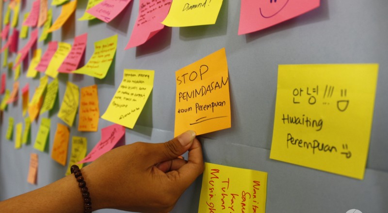 Seorang mahasiswi menempelkan opininya di papan yang…