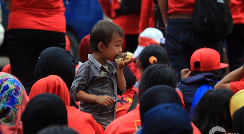 Seorang anak kecil sedang asik menyantap kue diantara…