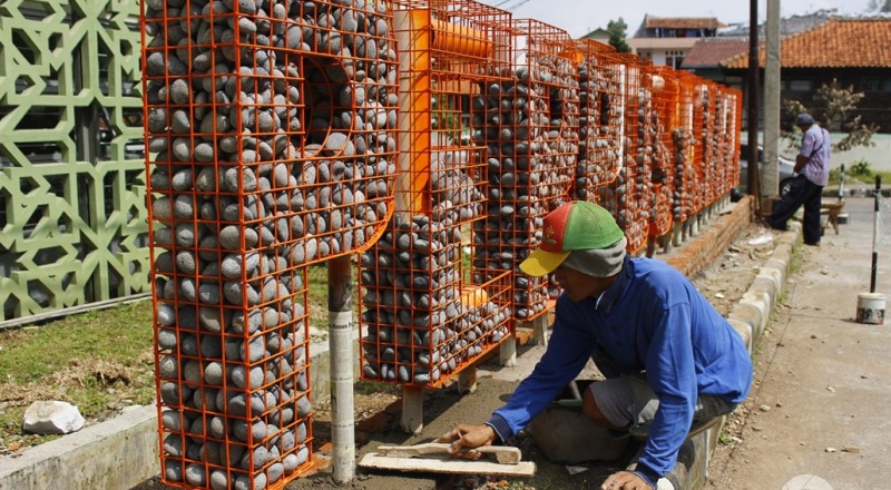 Seorang pekerja mengerjakan penyemenan batu bertuliskan…