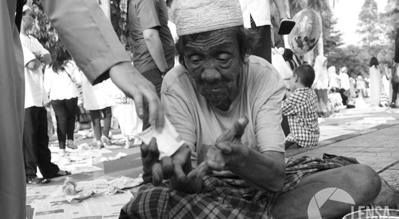Pengemis meminta sumbangan ditengah ribuan Jama’ah yang telah…