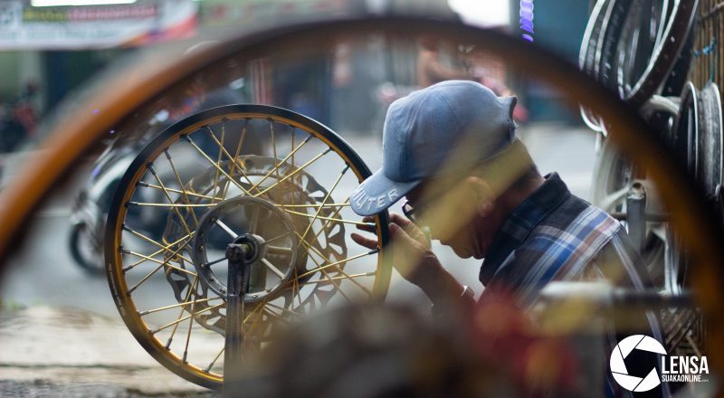 Enjang (64), menyelesaikan pemasangan velg di toko miliknya,…