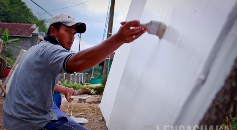 Ibat Supriyatna (30) membuat kain kanvas yang merupakan bahan…