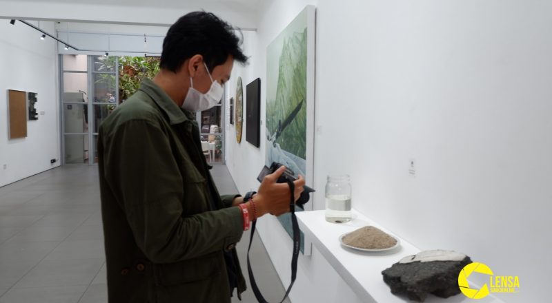 Seorang pengunjung sedang mengamati hasil karya seni yang…